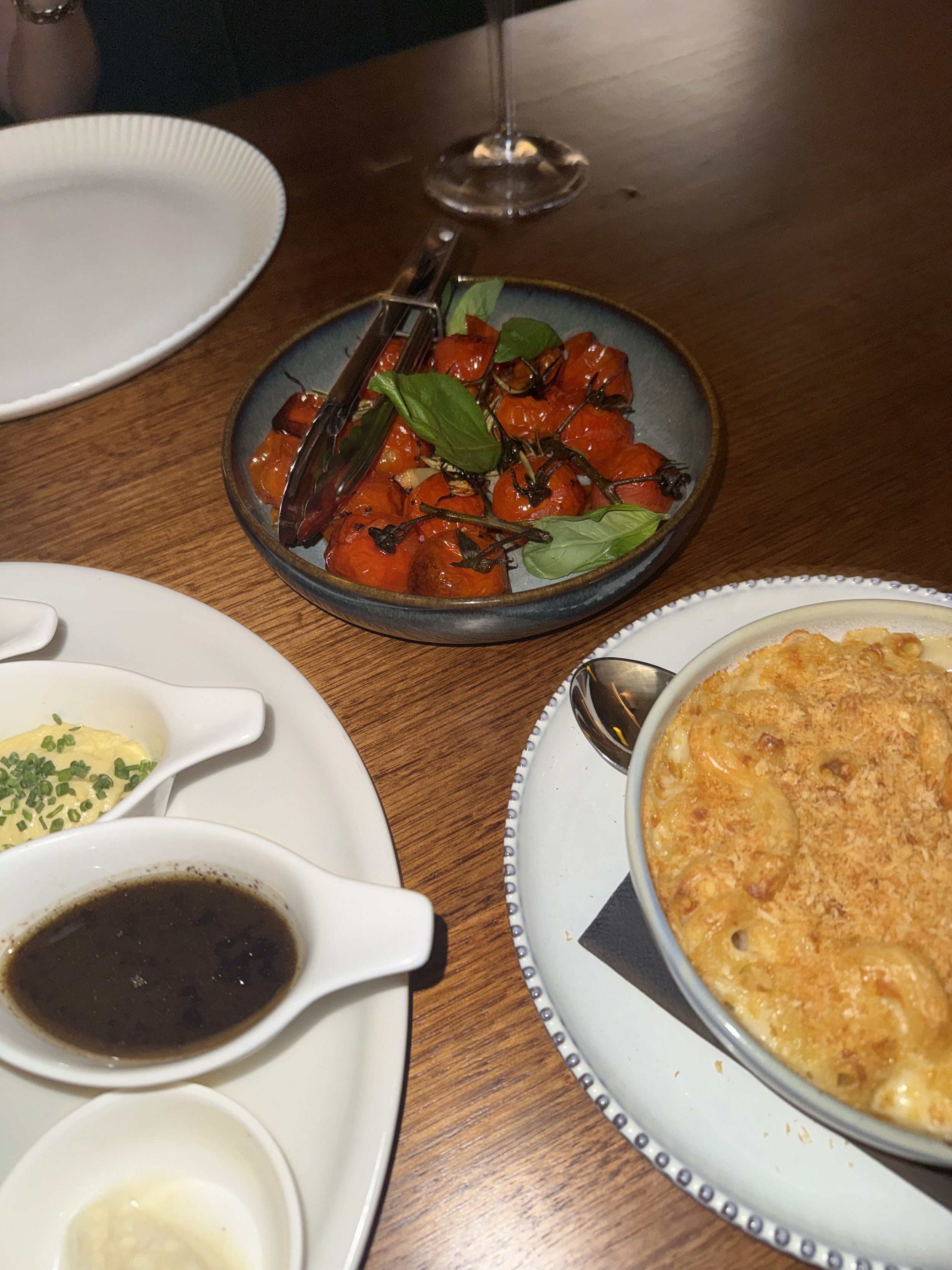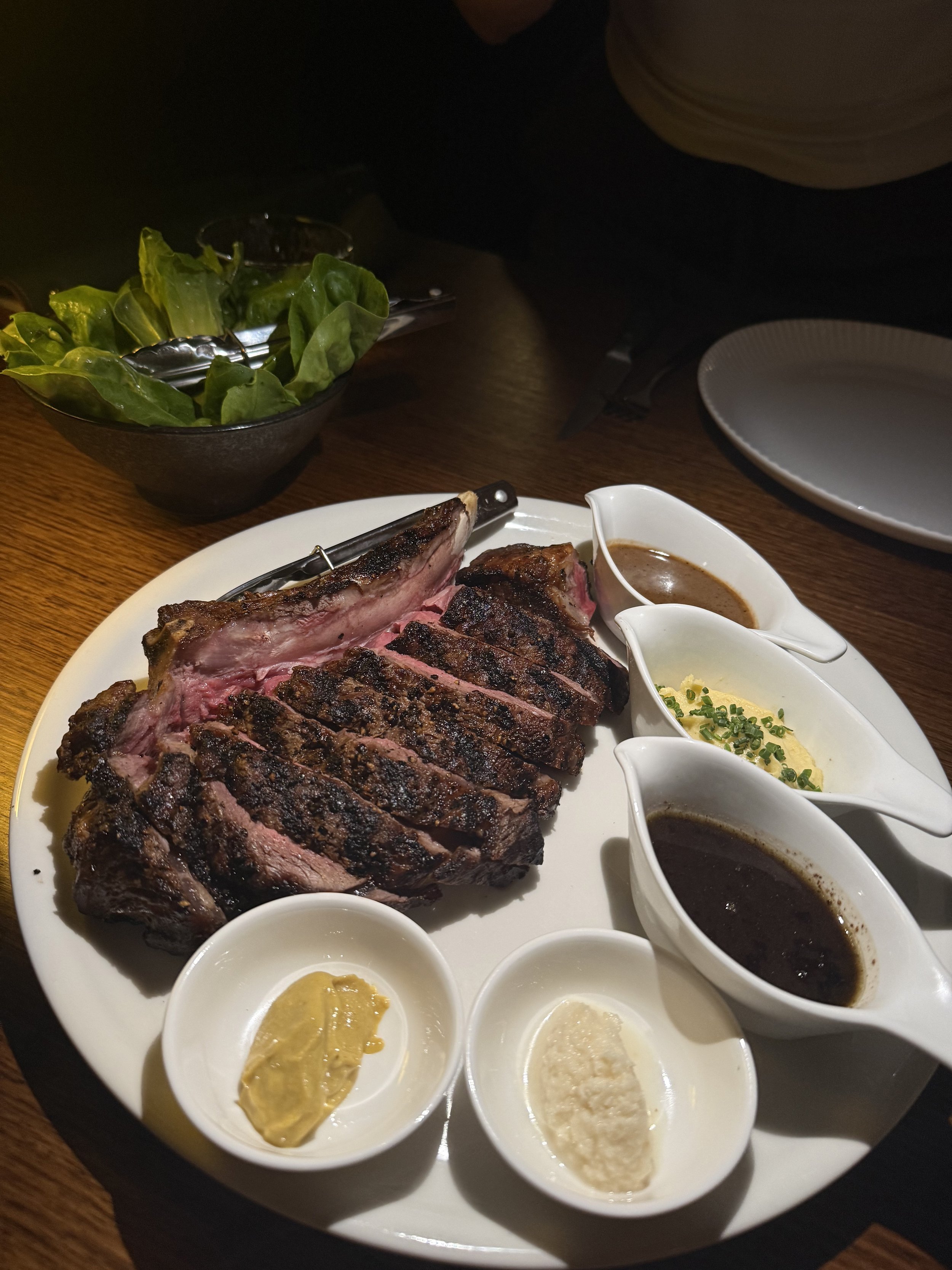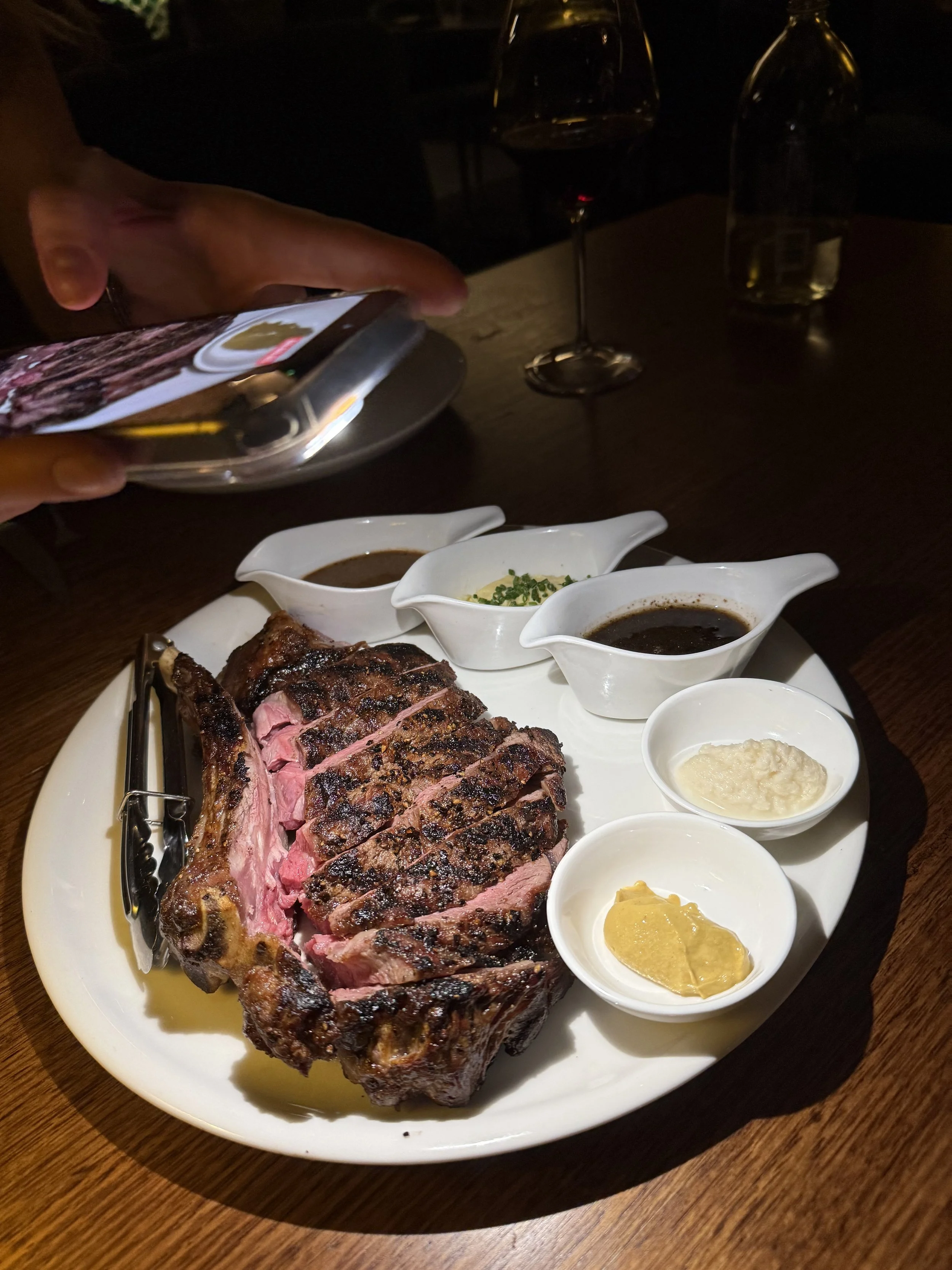 It’s hard to know where to start. We had some incredible entree’s starting with, Morton Bay bugs which are topped with garlic & chilli. A lovely fresh fish, cubed, on a bed of lettuce with mothers’ milk & a citrus sauce, this was unbelievable. We had a go at the kingfish crudo & the anchovy toast too, which H absolutely loved. There are 3 sauce options on offer with the steak, red wine jus, creamy pepper or bearnaise. H’s personal fav was the peppercorn; Mads was the jus. We also were treated to some of the best chippies we’ve had & the freshest salad we’ve had. H also indulged in the mac & cheese which was unbelievable and worth the cals.